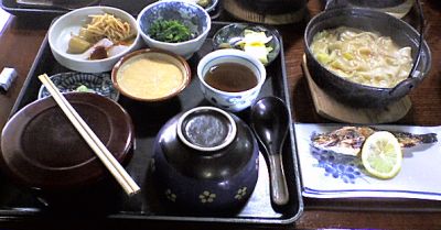 茶屋本陣という郷土料理の店で昼食。おきりこみ という うどんを食う。