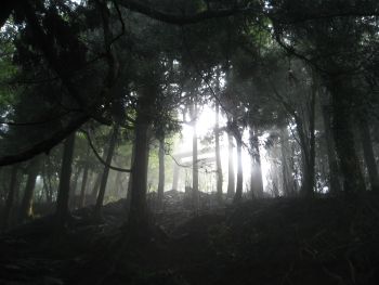 山頂付近。靄の中に見える鳥居が幻想的。