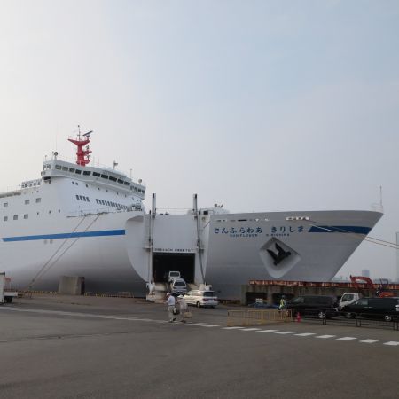 15時半頃で、フェリー出航まで時間があるので下道で埠頭へ向かう。 給油&コンビニに寄って、1時間前に到着した。 部屋は2等なので、先に乗った方が有利なんだけど