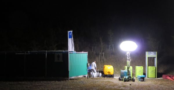 この辺は下が砂利になってるため、ペグが打ち込める。 ここは中央まで遠いのだが、バイクは場内を移動できる特権がある。 バスの発着場まで徒歩10分ほど、そこから循環バスで中央エントランスへ。