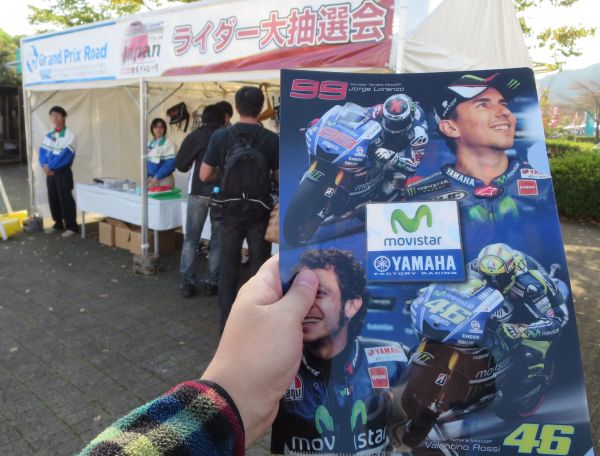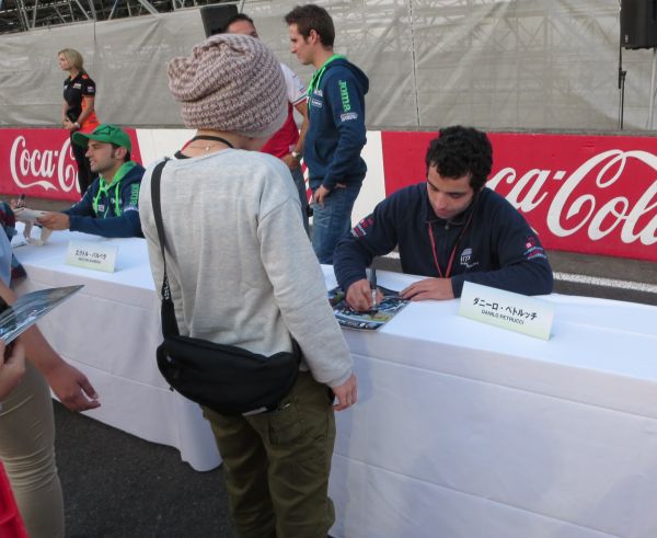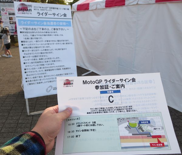 日差しが暑かったので、予選は日影のA席スタンドで見ることにした。 予選は Moto3、Moto2、MotoGPの順に進む。 Moto2では、中上が最後に6位に入って大盛り上がり。 MotoGPでは、トップが何度も入れ替わる熱い展開に。 予選終了後、サイン会の会場へ。 A〜Xまでの列があり、ライダーがランダムに割り当てられる。 サイン対象の色紙等は各自で用意とのこと(色紙は売店で販売してる模様)。 公式プログラムは黒っぽかったので、限定トートにサインしてもらうべく購入。