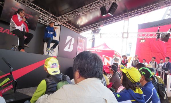 クリームたっぷりで美味い。 前夜祭が既に始まってて、解説者やライダーのトークショーが始まってた。 解説者はたぶん全員、ライダーは10人近く登場して色んな話を聞けた。