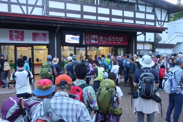 兄弟登山の第二弾は、富山の立山へ。 子供の頃から何度も登っている地元の山で、帰省時は立山連峰が良く見える。 2013年に登った時は悪天候で山頂を諦めたので、今回は山頂に行って雄山神社に参拝したい。 もともとは8月末に予定していたが、天気予報が悪く膝の調子も悪かったので諦め。 実家に登山荷物を発送し、金曜日の仕事帰りに富山へ移動した。 -------------------- 始発のケーブルカーに乗るべく 6時前の出発を考えていたが 次発の7:20を目指して、兄の車で6時過ぎに実家を出発する。 7時過ぎに駐車場を出て駅の切符売り場に到着したのは 7:25頃、めちゃ並んでる。