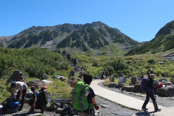30分ほど平坦路を歩いた後、雷鳥平へ激下り。石段を降りていく。