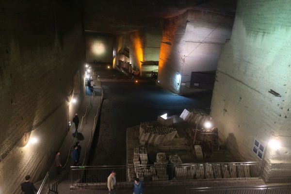 石切場なので、四角いブロックで編成されたマインクラフトっぽい地形になってる。 公開されているのは一部のエリアだけだが、それでも広大なスペースがある。 水が溜まってる処もあり、ポンプで排水しているみたいだ。 鍾乳洞の様に、色付きの灯りでライトアップ演出してある。
