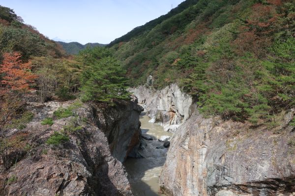 せっかくなので橋の先へ進む。 川沿いの林の中を歩く感じで、渓谷の景色は隙間から見える感じ。