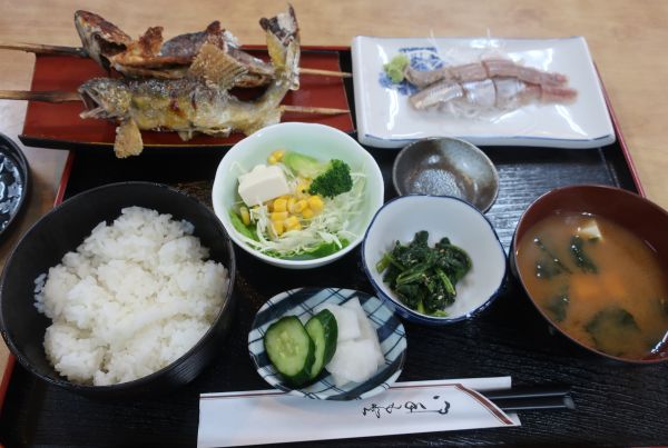 この橋で折り返して駅に戻る。 12時という事で昼食タイム、駐車場の近くにある食堂へ。 岩魚と鮎の塩焼きが食える定食を注文すると、魚を焼くのに時間がかかるとのこと。 あまり時間に余裕は無いけど、これも旅って事で待つことにする。
