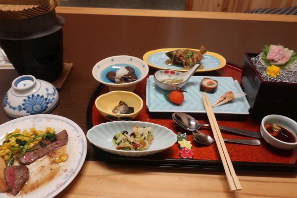 17時過ぎに裏磐梯のセブンイレブンに到着したが、周りは真っ暗だ。 ここからレークラインを走る予定だったが、この暗さだと国道一択だろう。 フリースを着込んで、R459を車の後ろに着いてゆっくり走る。 最後の宿に向かう山道は街灯が無く真っ暗で、バックミラーも真っ黒に。 夕飯は19時からということで、部屋で少し休憩してから風呂へ。 お湯は熱めだが、入れないほどでは無い感じ。43度ぐらいかな。 夕飯は生ビールを注文、風呂上がりで美味い。