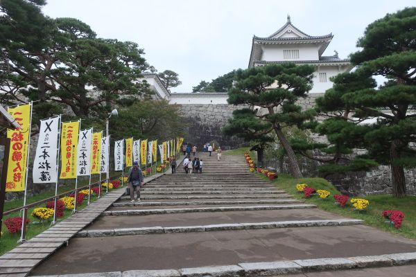 巨大な水堀に囲まれた平城で見所は多そうだが、とりあえず天守閣に向かう。 天守閣の中は順路が決まっており、展示を見ながら上に登っていく。