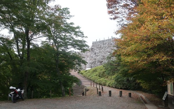 バイクを停めて撮影する際に、スタンドの逆から降りて倒しそうに。 県道を快走して、会津若松の市街地へ。 駐車場は西出丸にあり、そこまで城の雰囲気を感じながら進む。