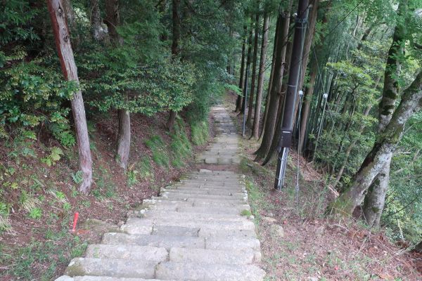 景色を観て、奥の院を見たりと周辺を散策。 途中駅で降りて温泉寺を見学した後は、長い石段を下りていく。