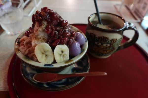 土産屋を物色してたけど、やっぱり特に買うものは無い感じ。 ぜんざい食べながら涼みたいと、お菓子御殿2Fのレストランへ。