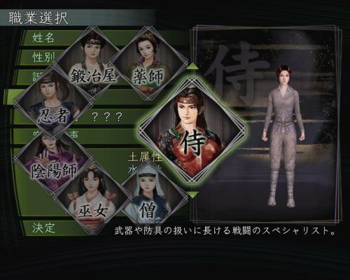 | 職業 | :侍、僧侶、神官、陰陽、忍者、鍛冶、薬師 の7つ。 |