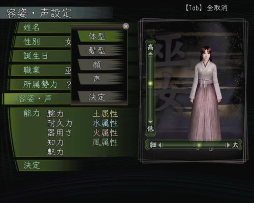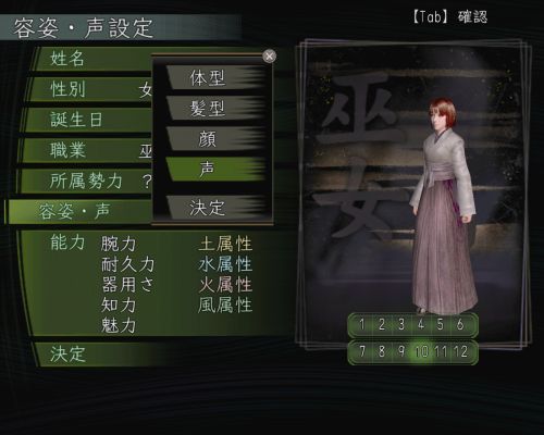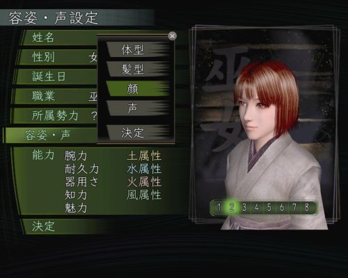 | 出身国 | :日本各地から勢力を選択。能力値ボーナスあり。 |
