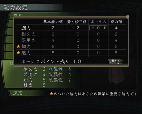 | 能力値 | :10ポイント割り振る。※初期ステータス重要 |